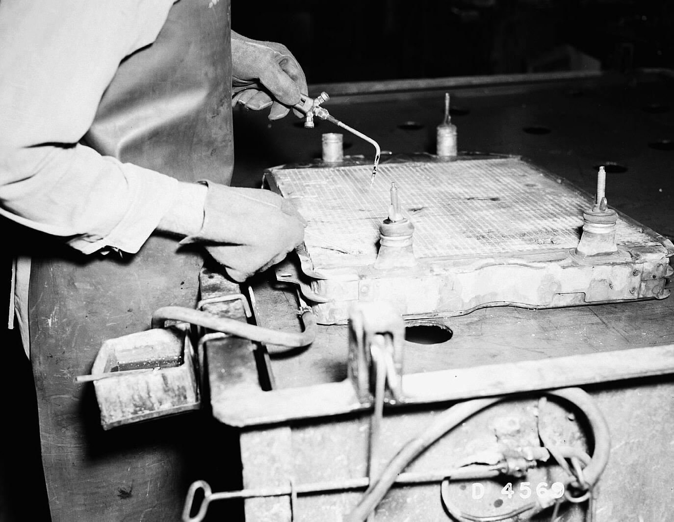 (1944) employee reparing radiator leaking area...
